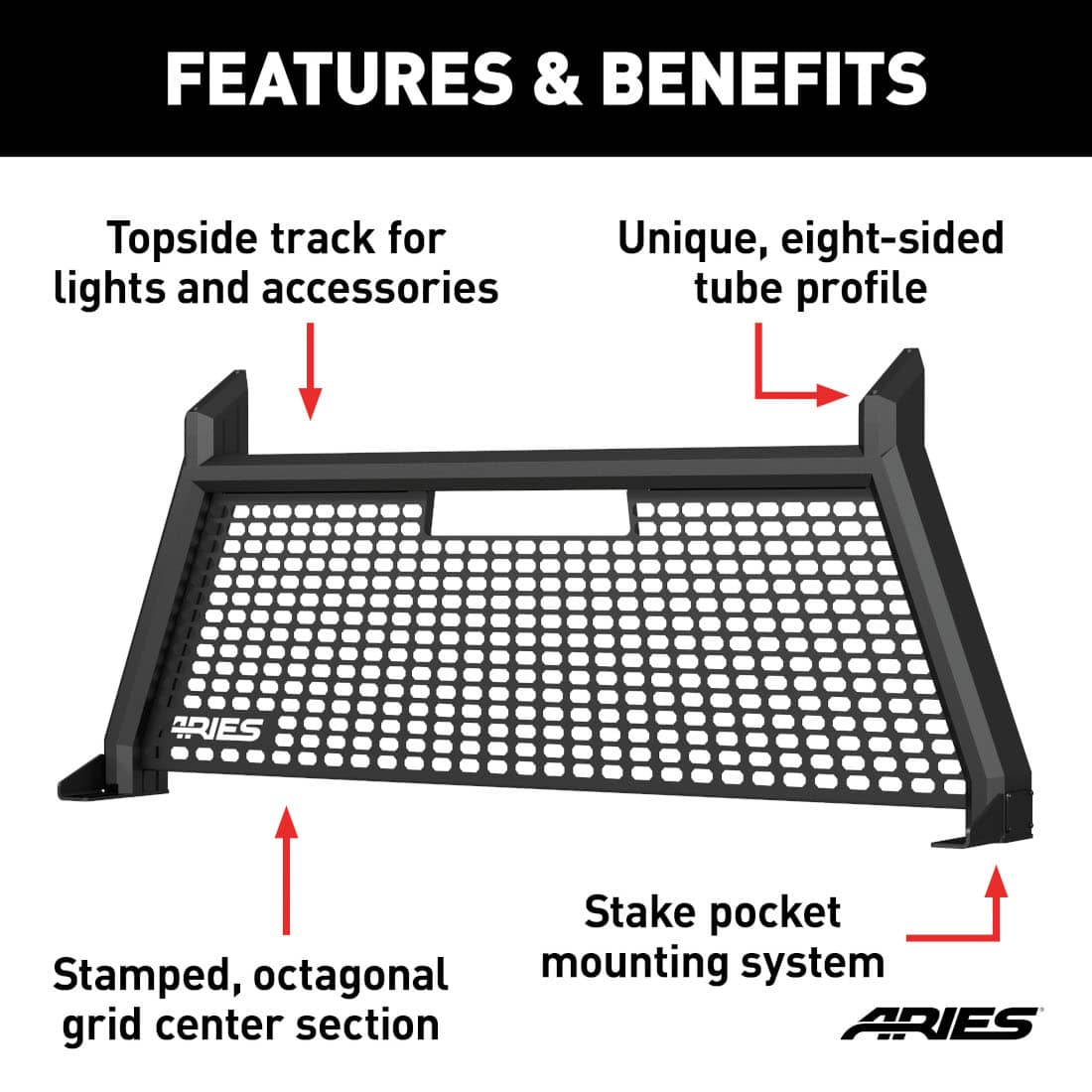 ARIES BLACK ADVANTEDGE HEADACHE RACK ; 07-18 SILVERADO/SIERRA 1500/ 07-19 SILVERADO/SIERRA HD 6'6" & 8' DUALLY/ 19-24 RAM 1500